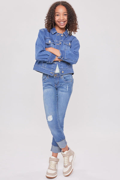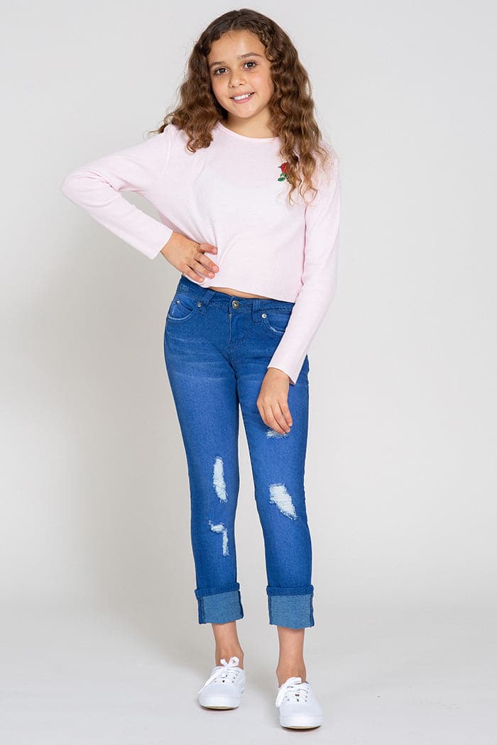 Jeans for the girl who’s ready to take on any adventure! Our WannaBettaFit Cuff Skinny Jean is made with our signature WBF heart-shaped stitching and uniquely crafted pockets for the best fit ever! Also designed with super stretchy denim for movement and all-day wear. This jean is fitted throughout and features a mid-rise. Designed with subtle fading, light distressing, and wide cuffed hems for a “too cool for school” vibe. Pair with your favorite graphic tee and sneakers for a laid back look!