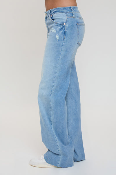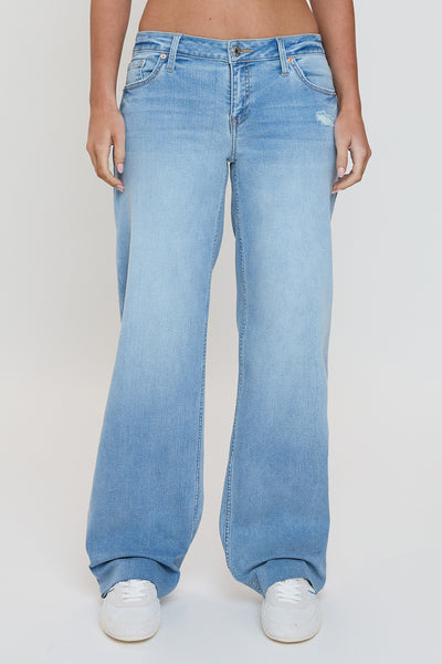 Add a bold touch to your denim collection with these Women's Britney Low Rise Wide Leg Jeans. They bring a stylish edge to a classic straight leg fit. Designed with a low rise for a modern look, these jeans include belt loops and a button and zipper fly for easy wear.