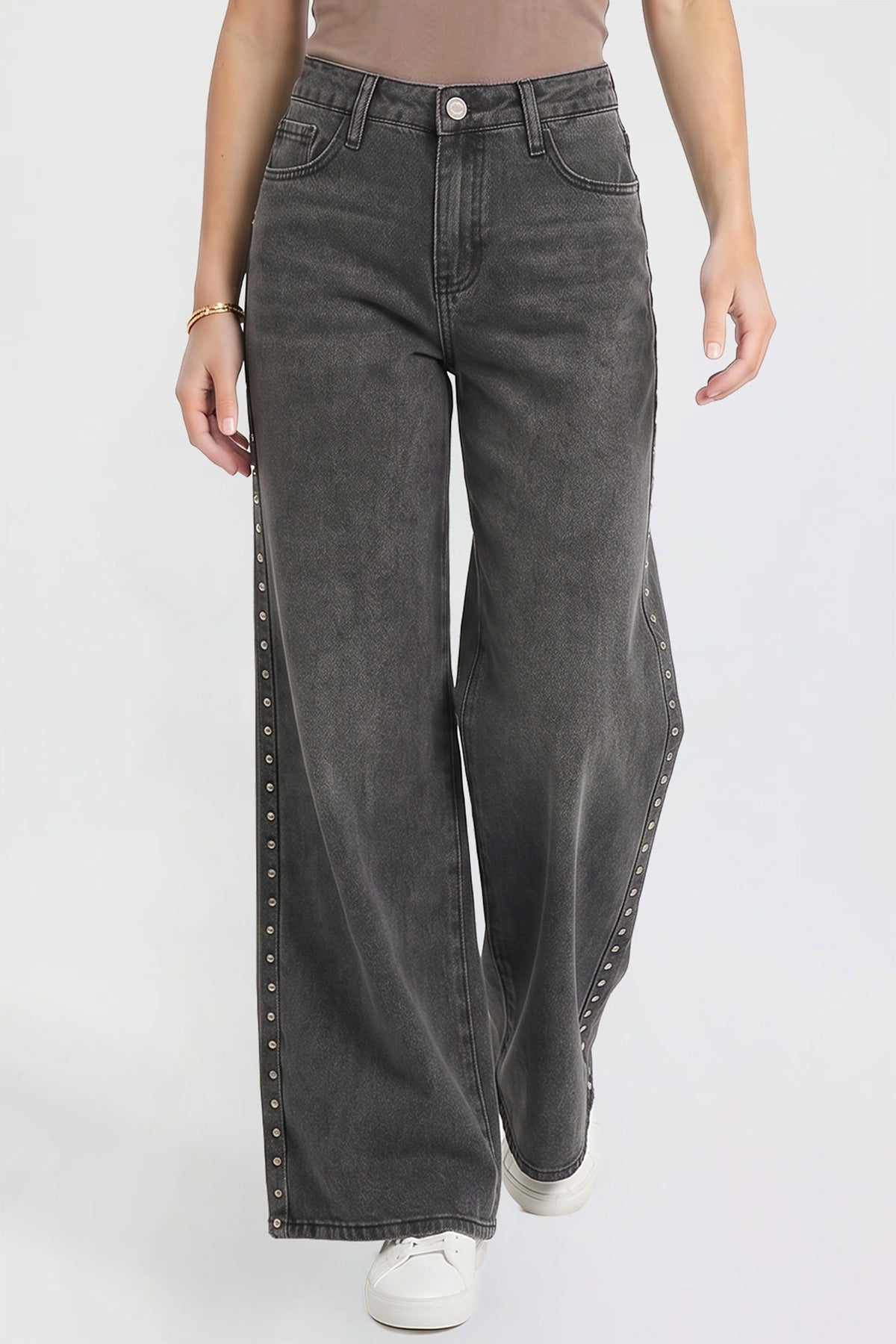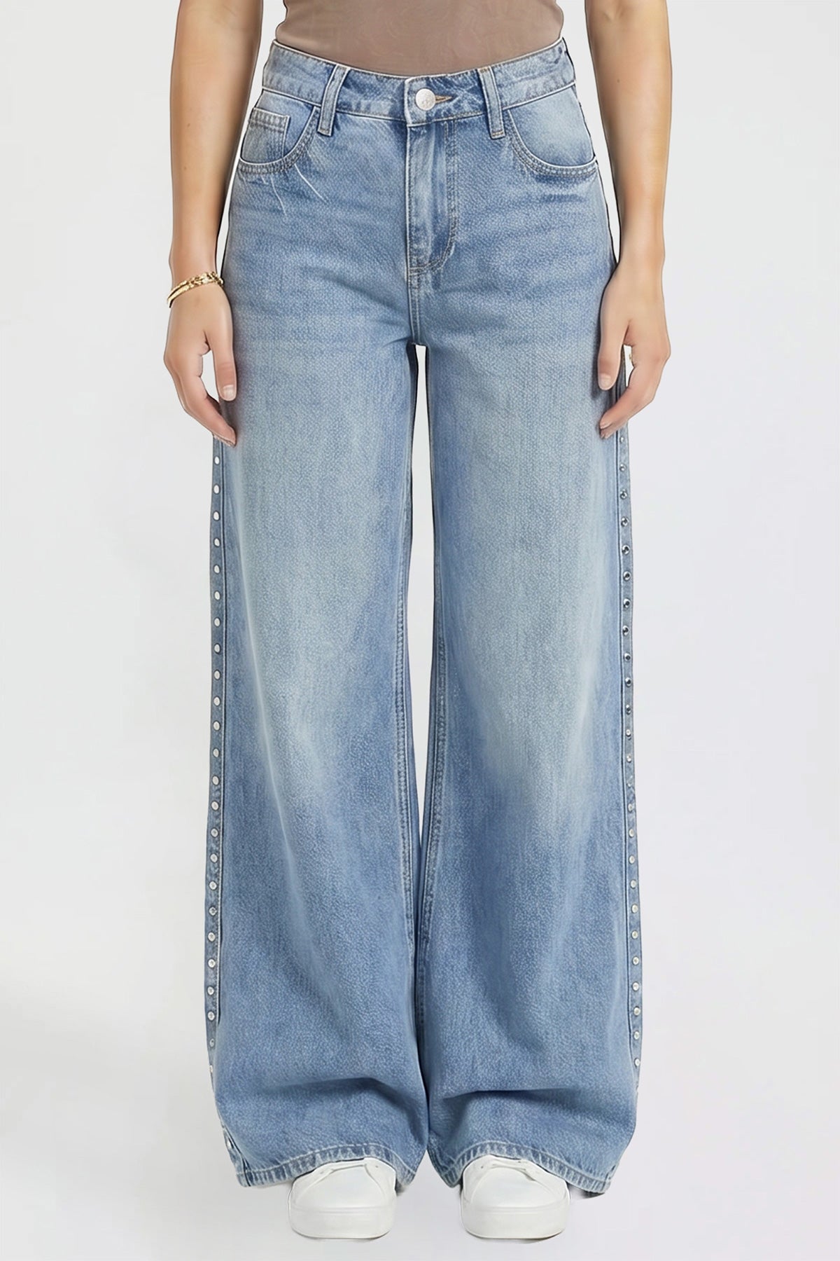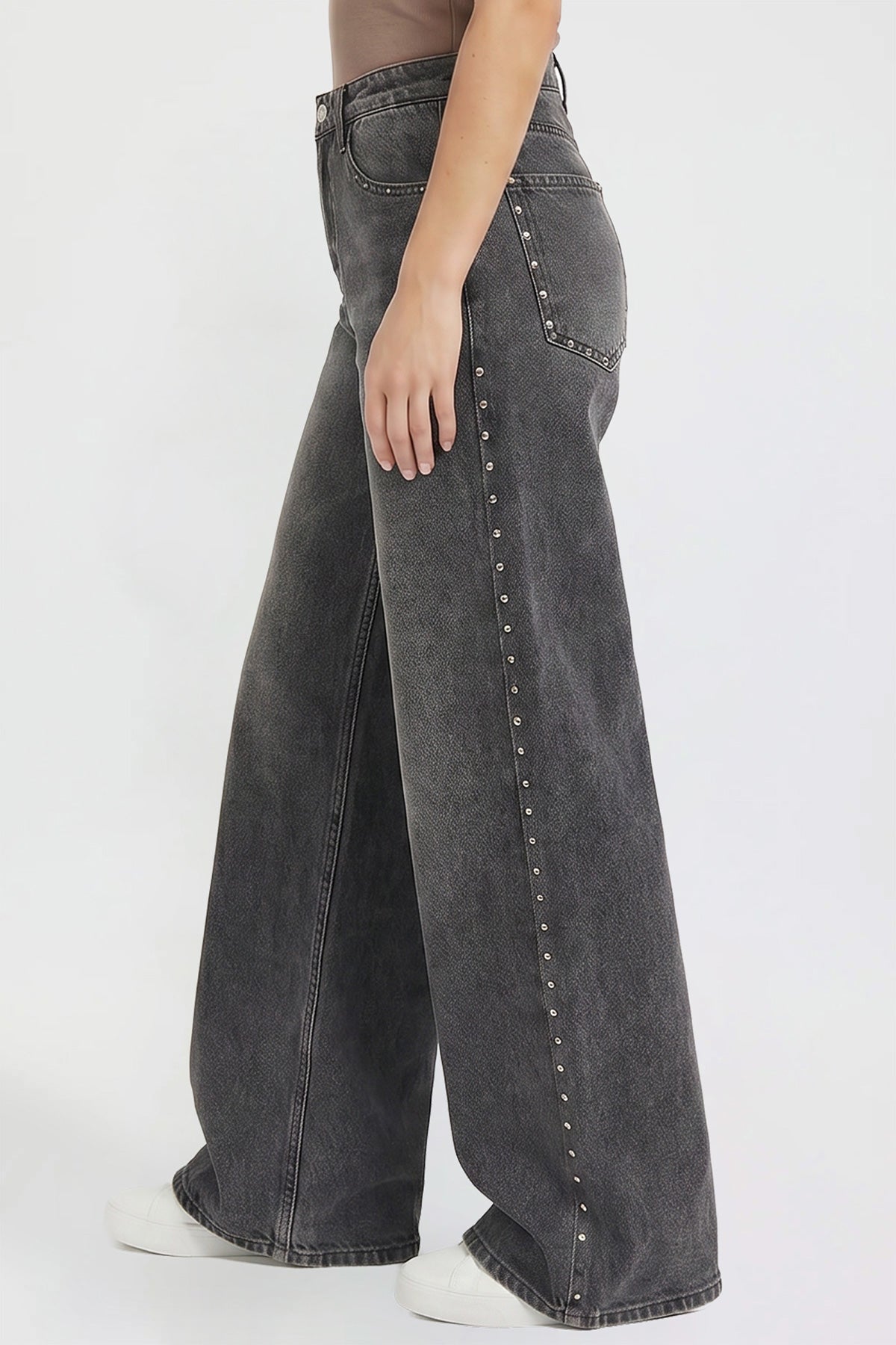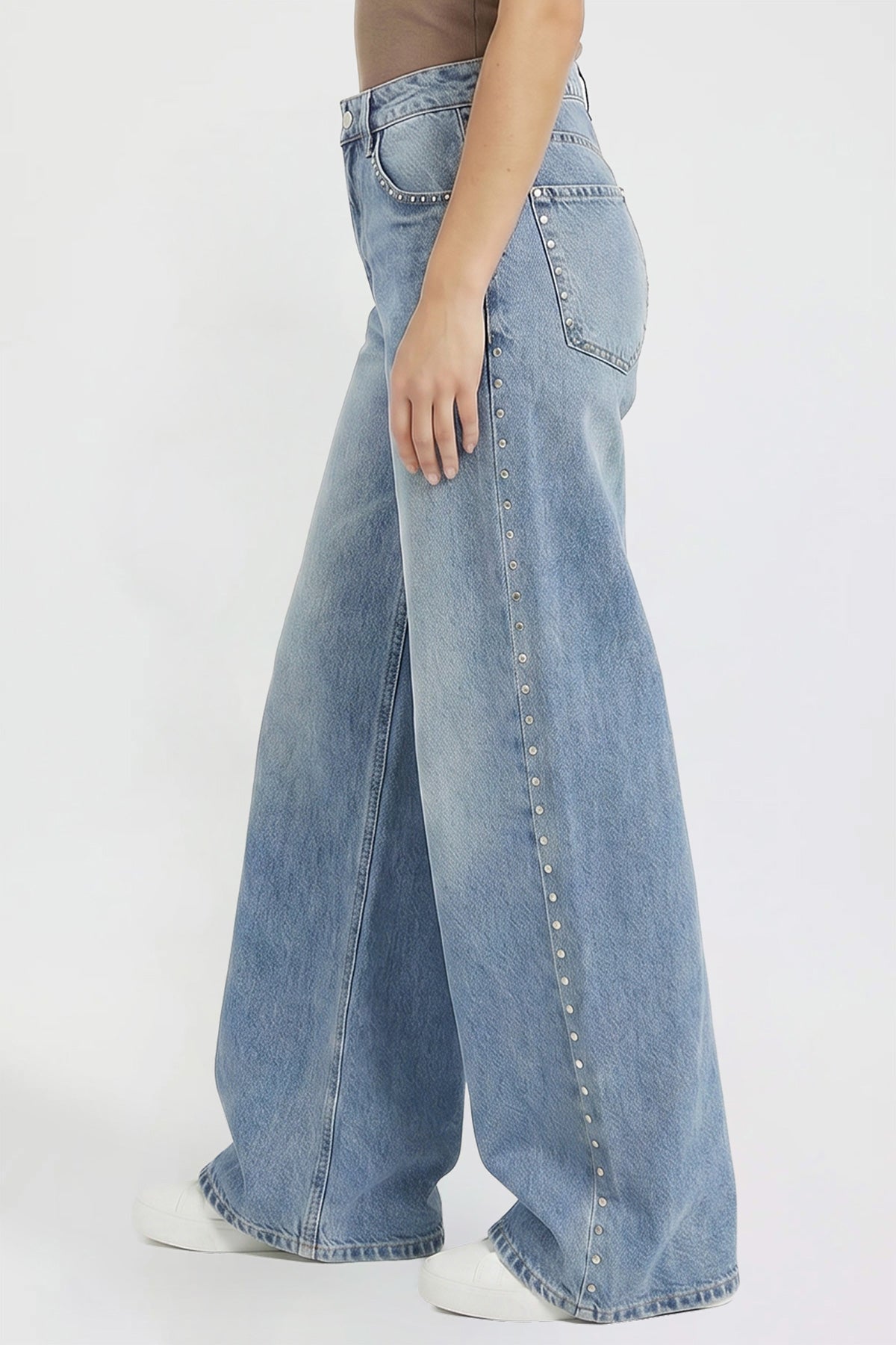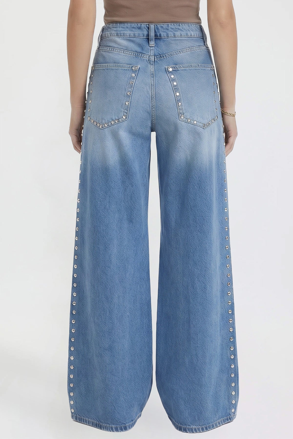 Make a statement in our Women’s Studded Relaxed Super Wide Leg Jeans, designed for bold style with a modern edge. Made from rigid, non-stretch denim, this standout pair features a relaxed fit with an ultra-wide leg for a strong, fashion-forward design. Studded detailing along the side seams adds just the right amount of attitude, while classic five-pocket styling, belt loops, and a button-and-zipper fly keep the look grounded in timeless denim design. Perfect for elevating everyday outfits or owning the spotlight on a night out.