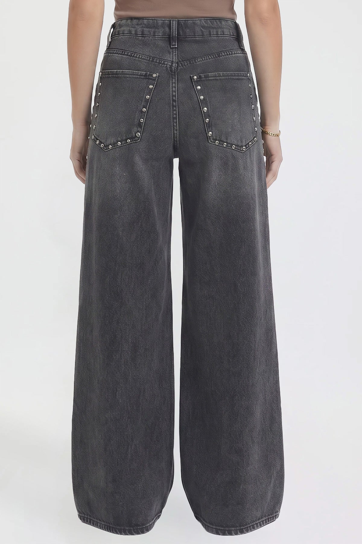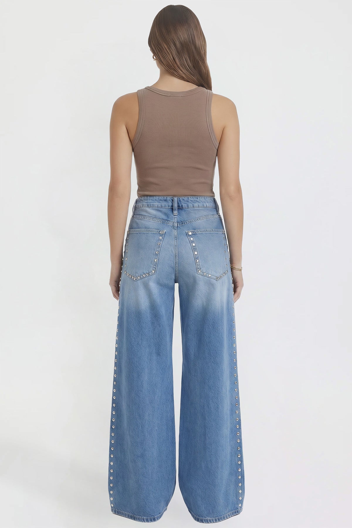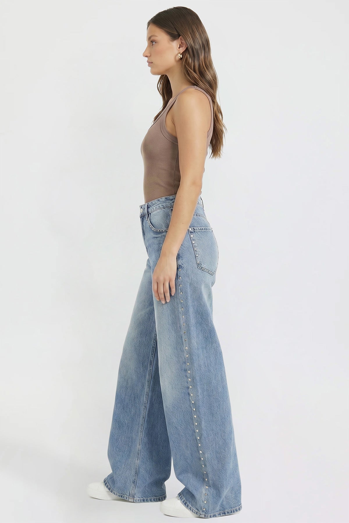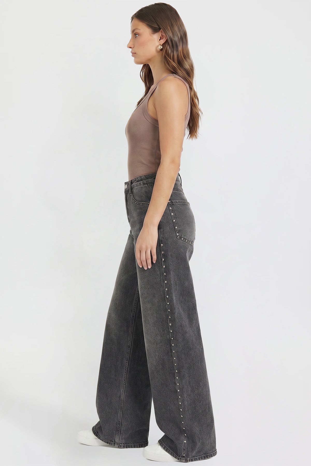 Make a statement in our Women’s Studded Relaxed Super Wide Leg Jeans, designed for bold style with a modern edge. Made from rigid, non-stretch denim, this standout pair features a relaxed fit with an ultra-wide leg for a strong, fashion-forward design. Studded detailing along the side seams adds just the right amount of attitude, while classic five-pocket styling, belt loops, and a button-and-zipper fly keep the look grounded in timeless denim design. Perfect for elevating everyday outfits or owning the spotlight on a night out.