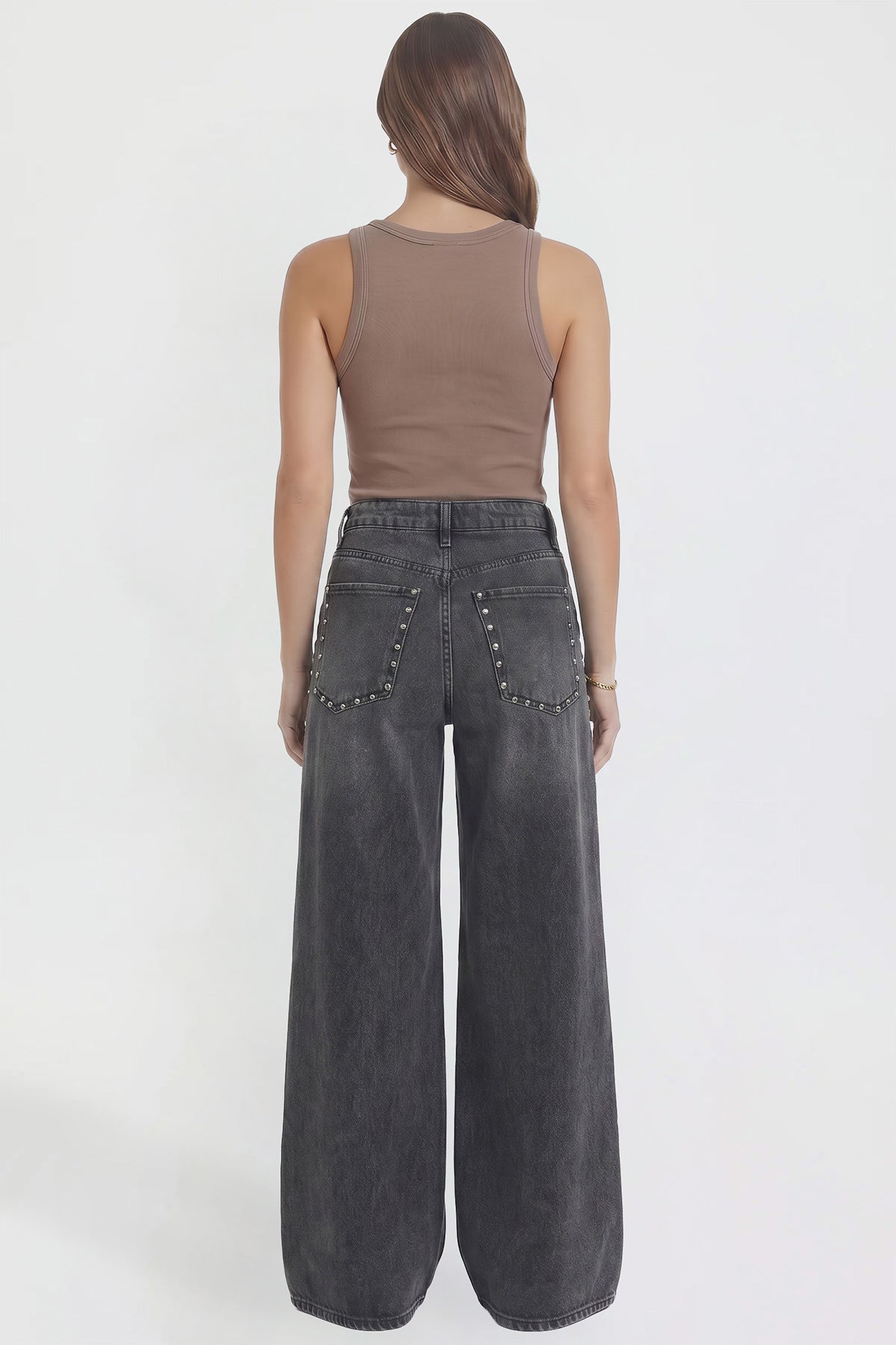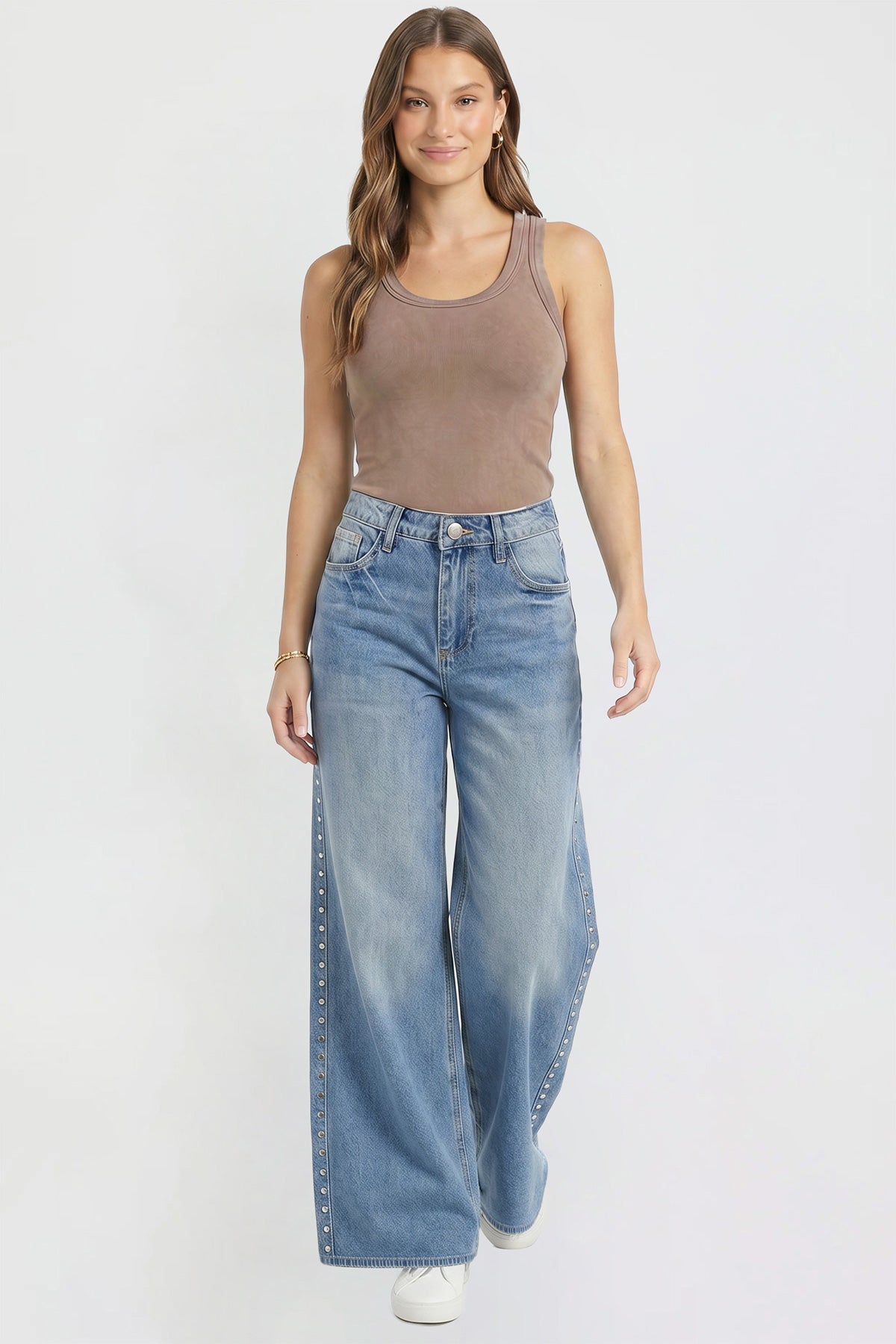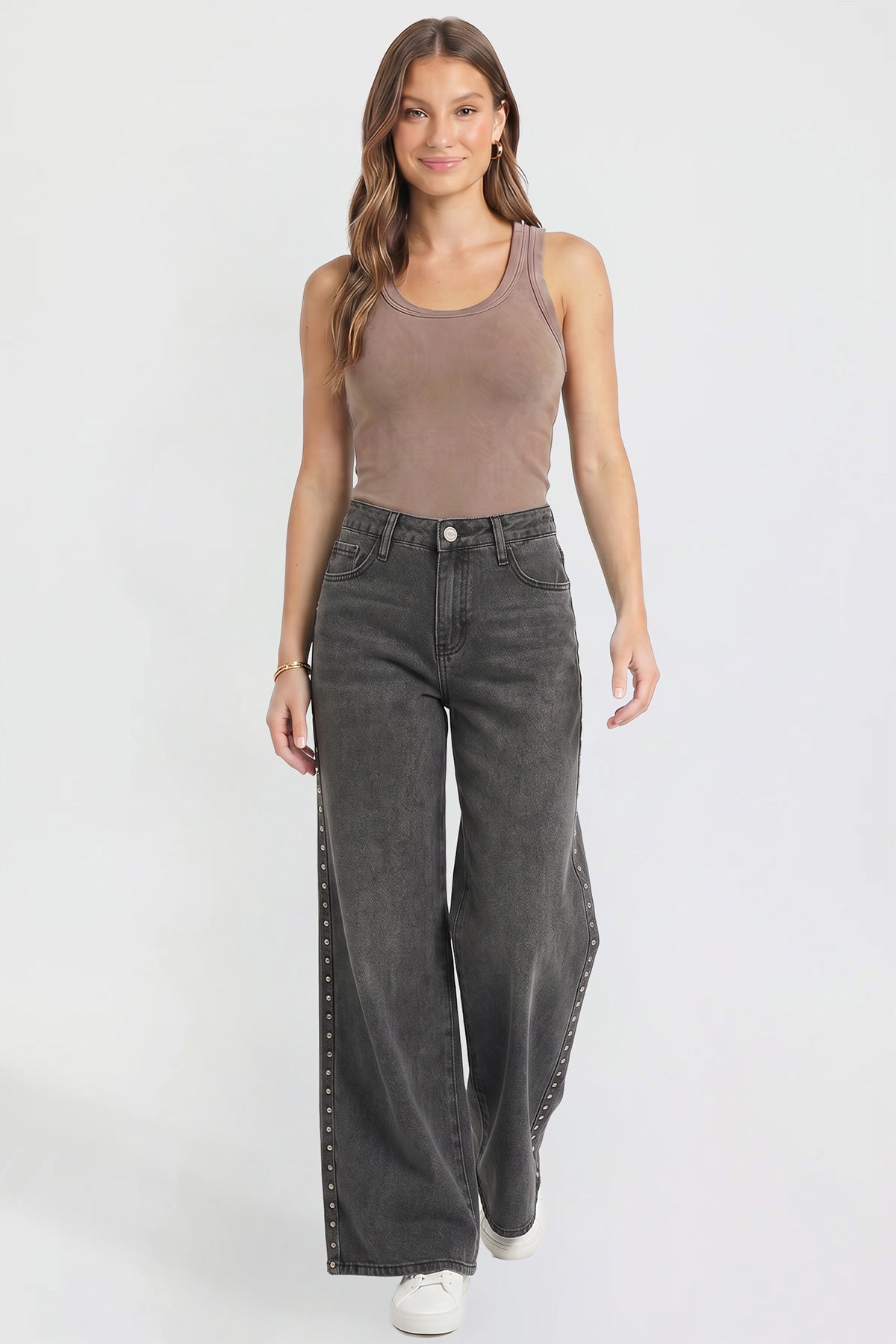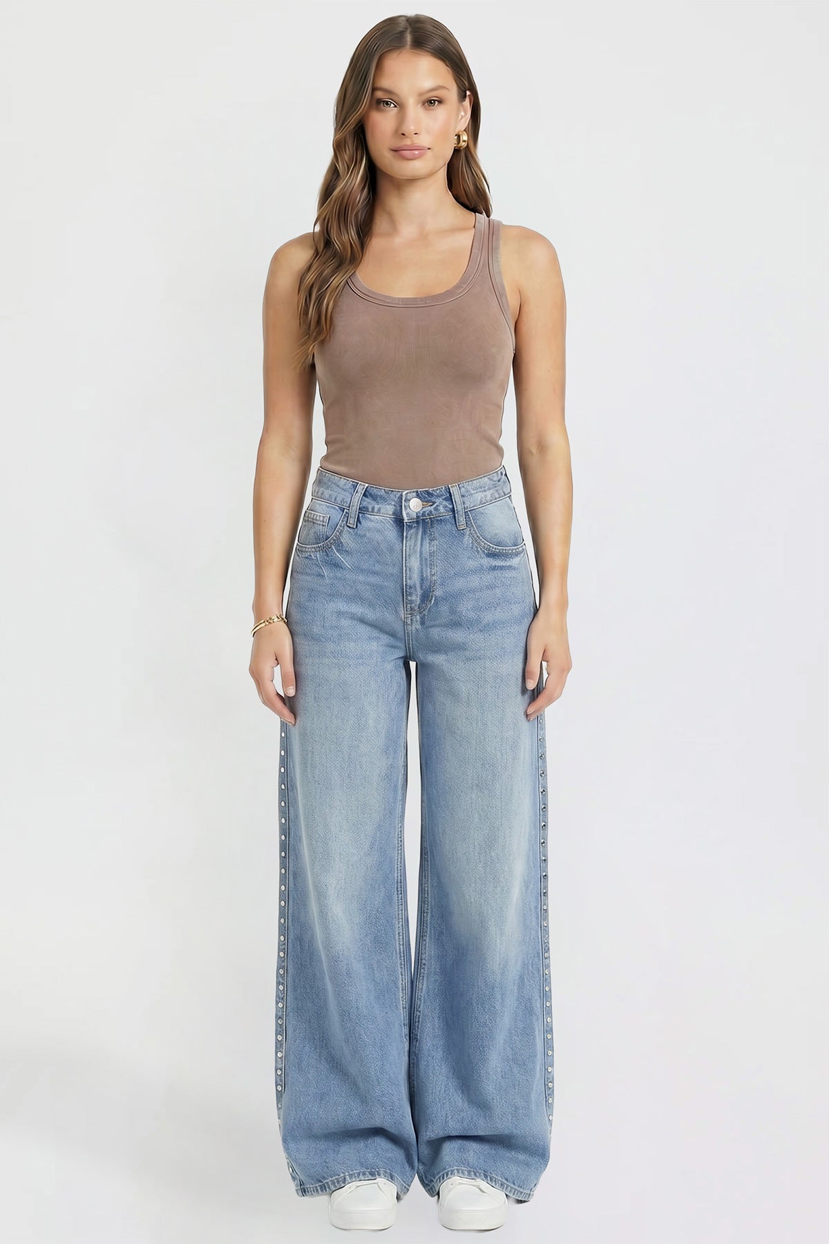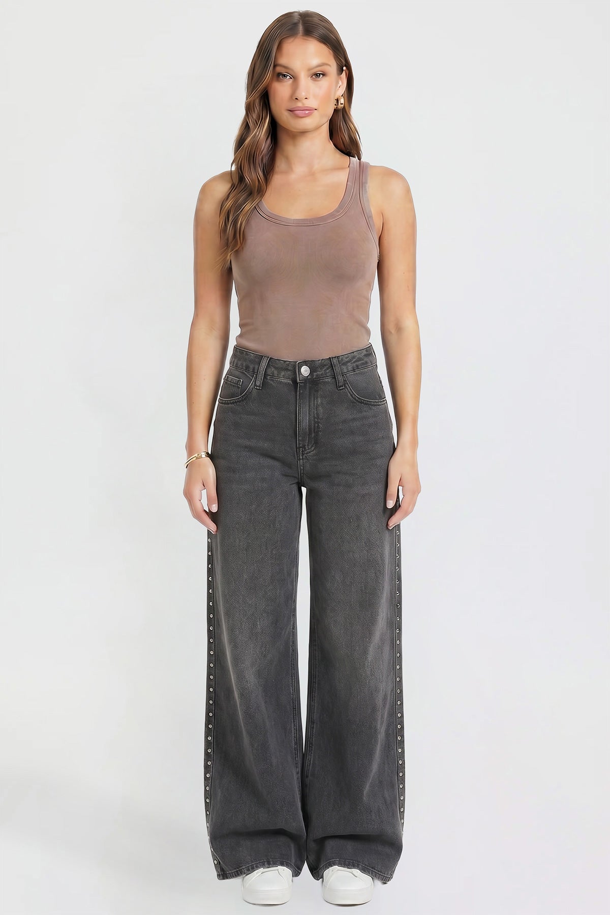 Make a statement in our Women’s Studded Relaxed Super Wide Leg Jeans, designed for bold style with a modern edge. Made from rigid, non-stretch denim, this standout pair features a relaxed fit with an ultra-wide leg for a strong, fashion-forward design. Studded detailing along the side seams adds just the right amount of attitude, while classic five-pocket styling, belt loops, and a button-and-zipper fly keep the look grounded in timeless denim design. Perfect for elevating everyday outfits or owning the spotlight on a night out.