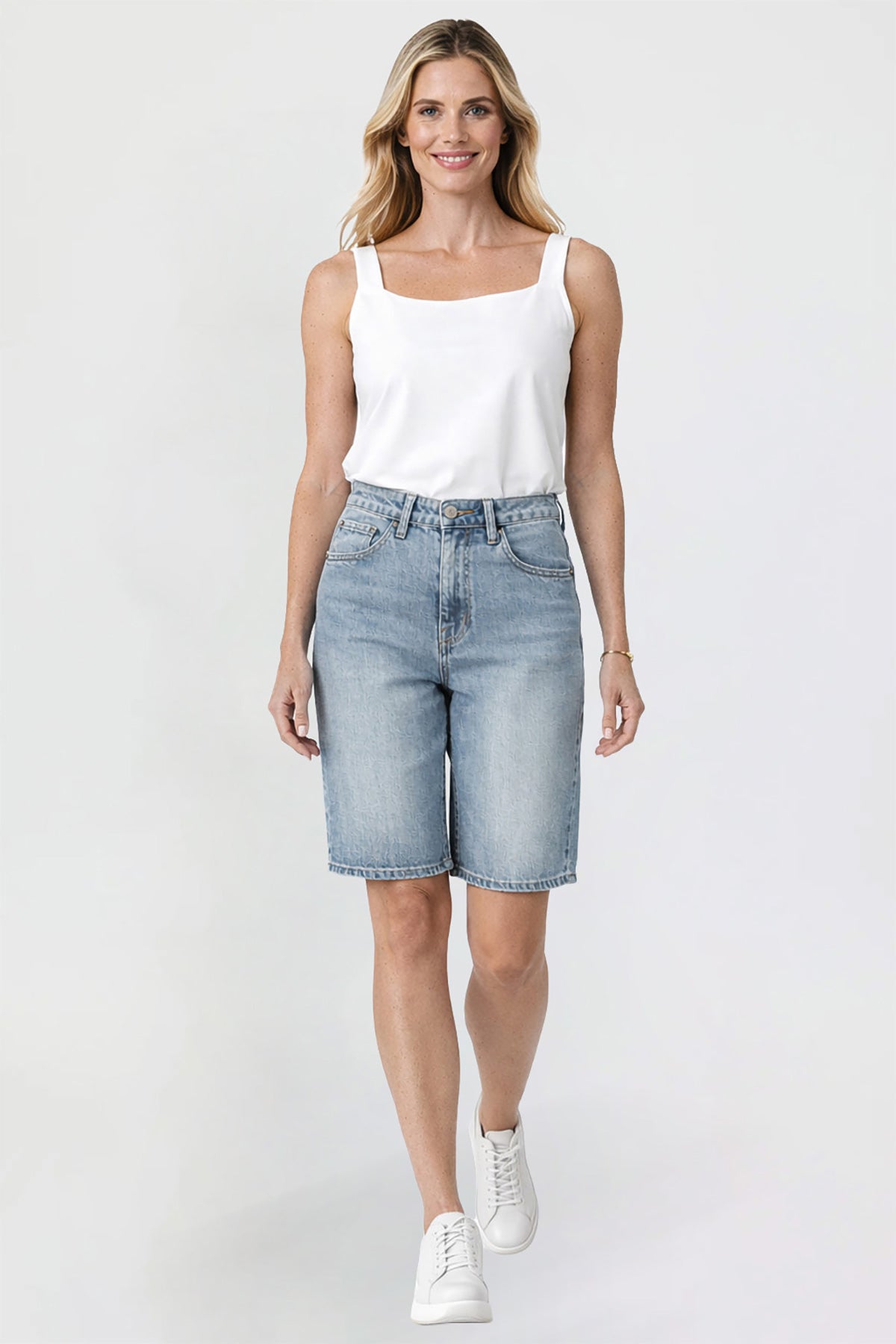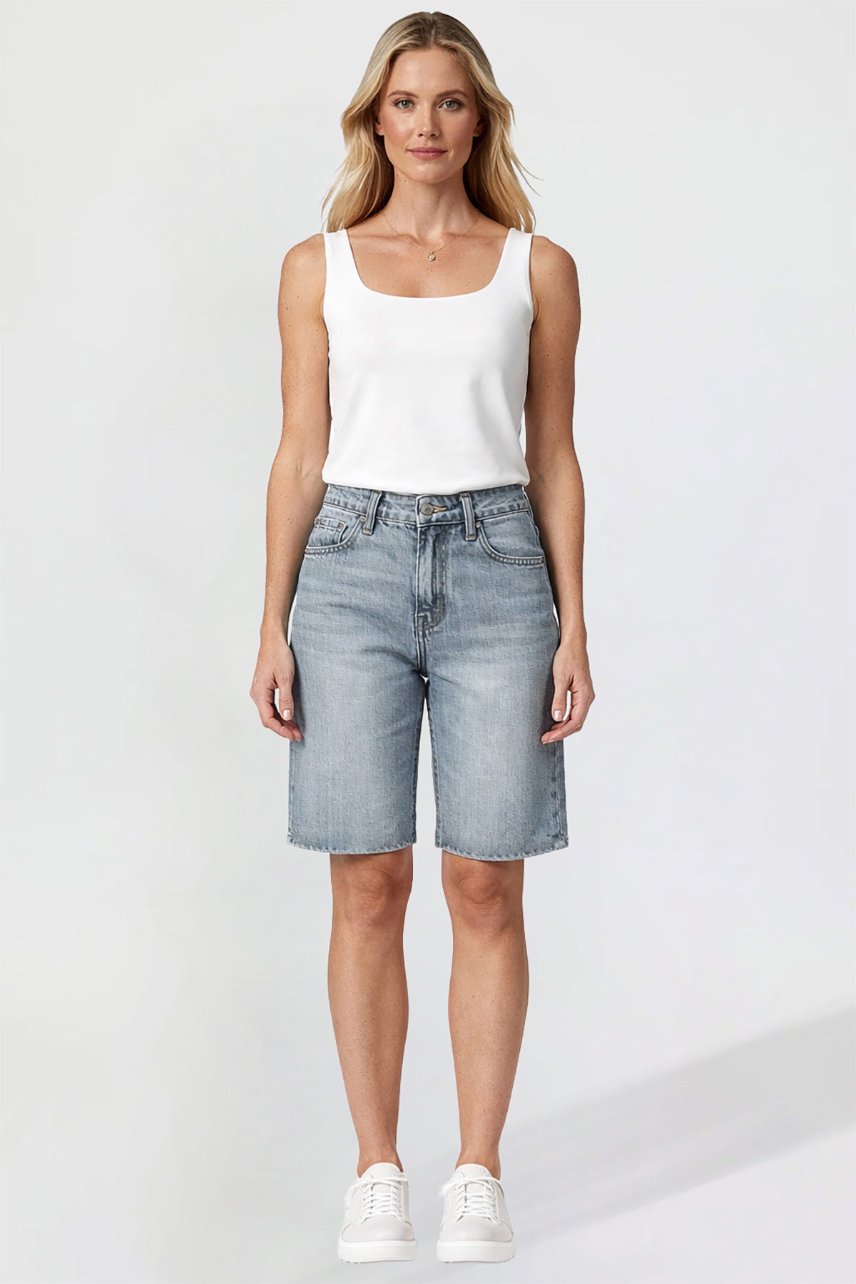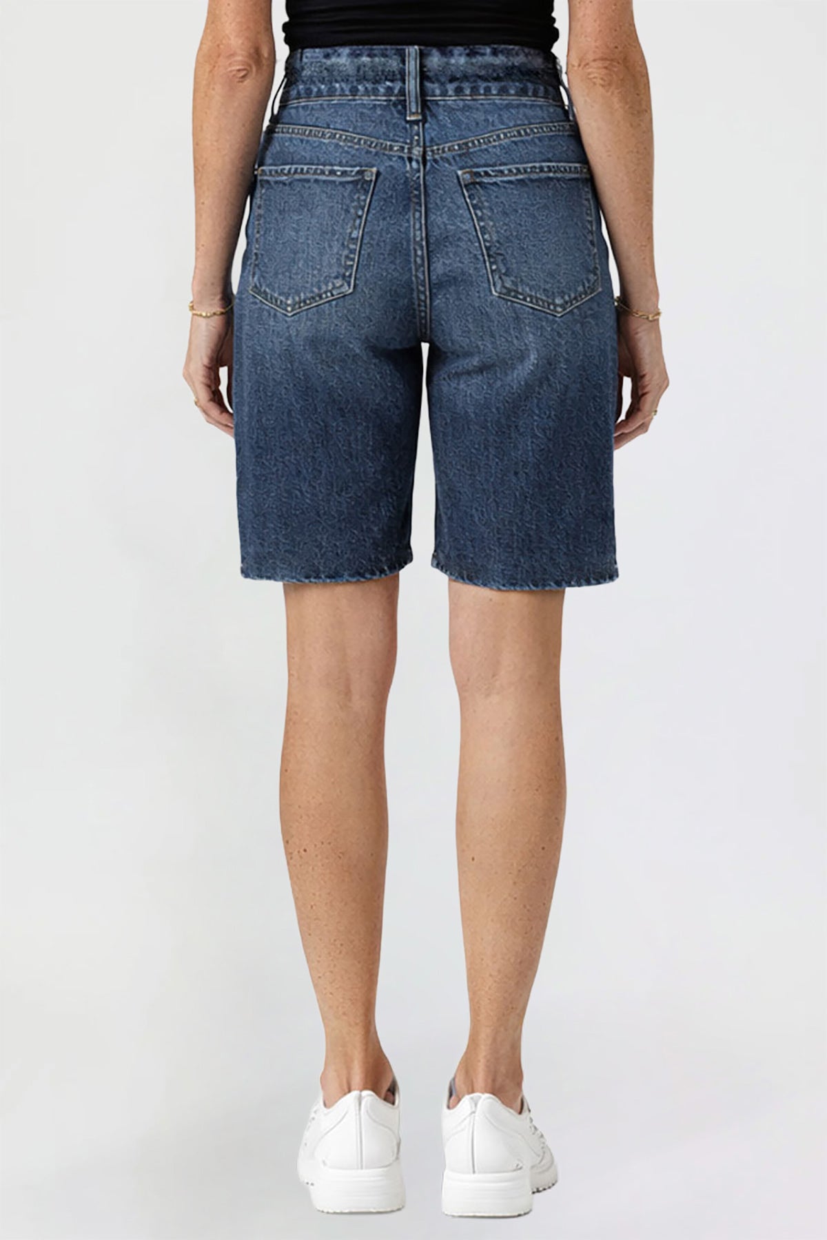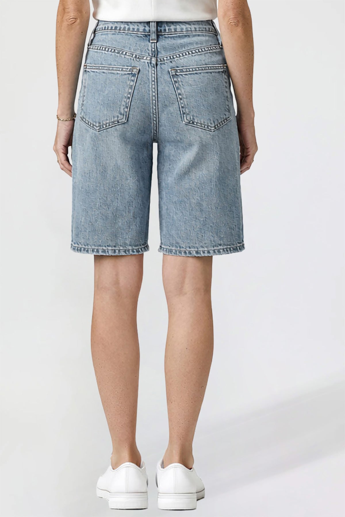 Stay cool and casual in our Women’s Relaxed Bermuda Shorts. Designed with a relaxed fit and longer inseam, these shorts offer effortless coverage and all-day comfort. The frayed hem adds a touch of laid-back style, while classic five-pocket styling and a button-and-zipper closure keep them timeless and easy to wear. Made from durable cotton denim, they’re perfect for everyday summer adventures.