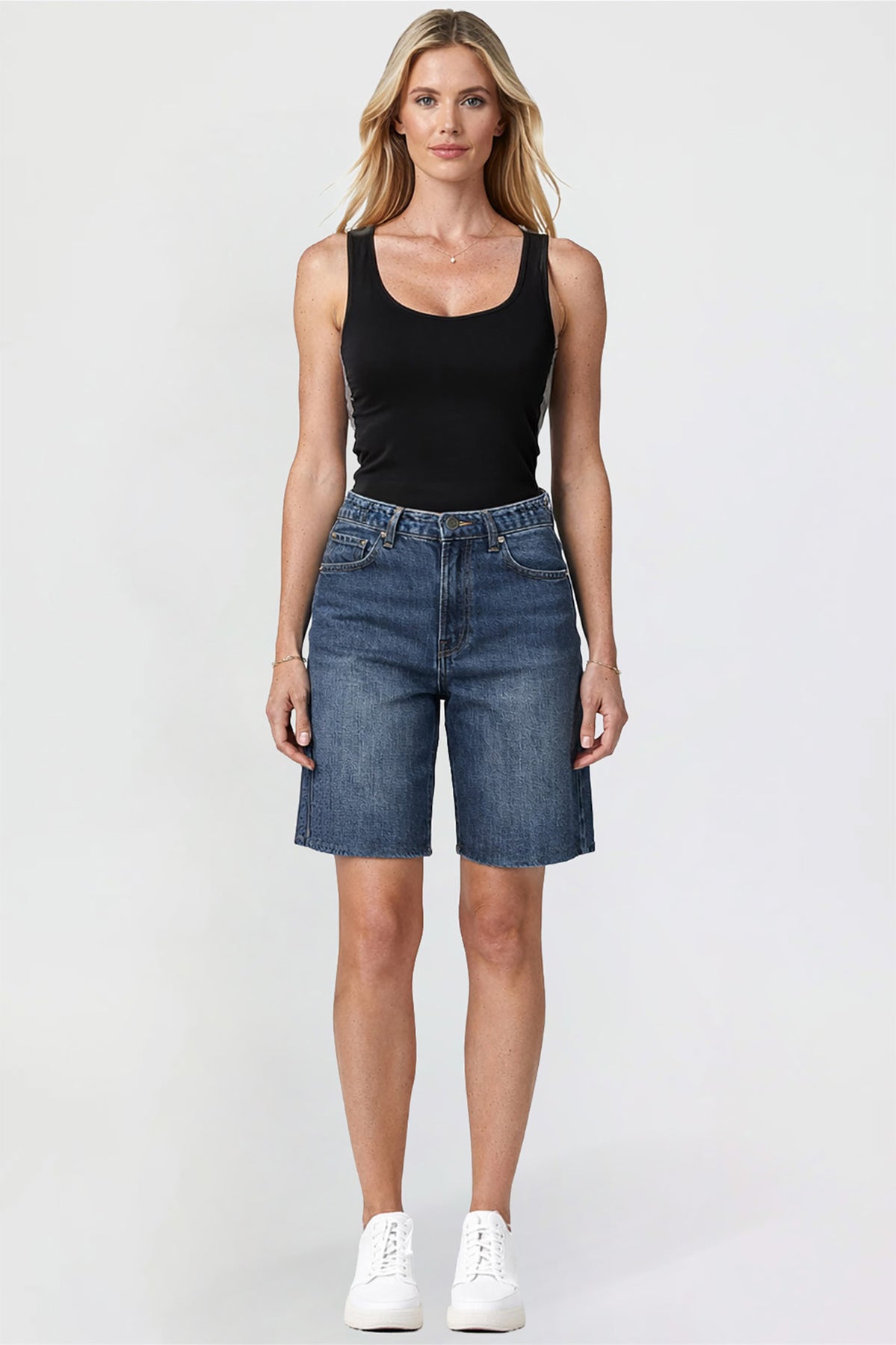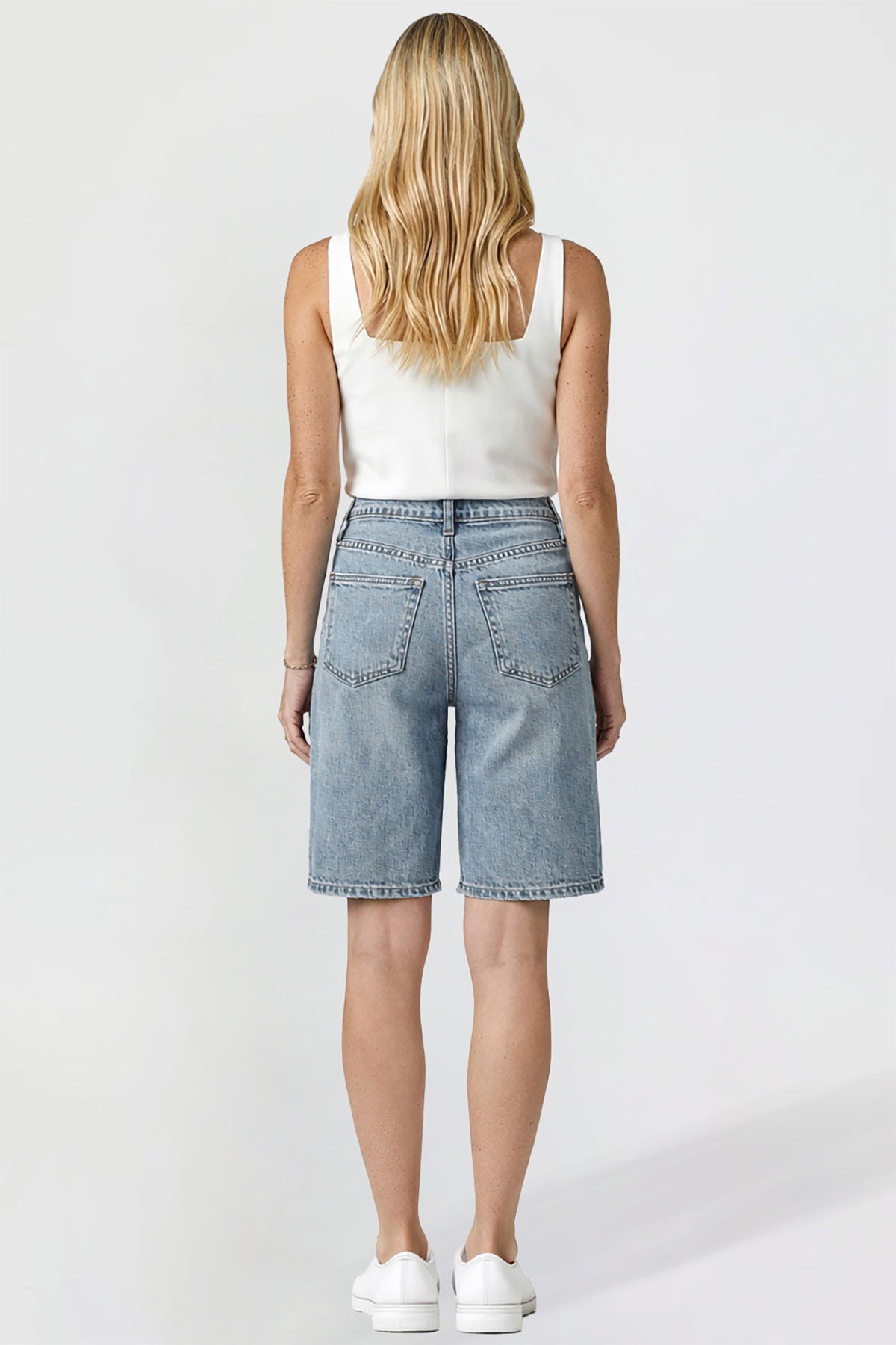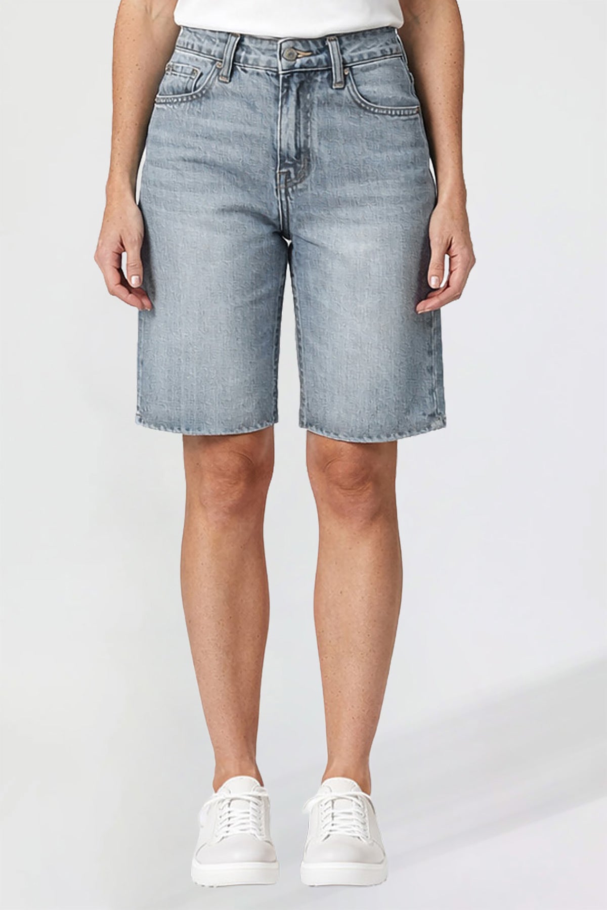 Stay cool and casual in our Women’s Relaxed Bermuda Shorts. Designed with a relaxed fit and longer inseam, these shorts offer effortless coverage and all-day comfort. The frayed hem adds a touch of laid-back style, while classic five-pocket styling and a button-and-zipper closure keep them timeless and easy to wear. Made from durable cotton denim, they’re perfect for everyday summer adventures.