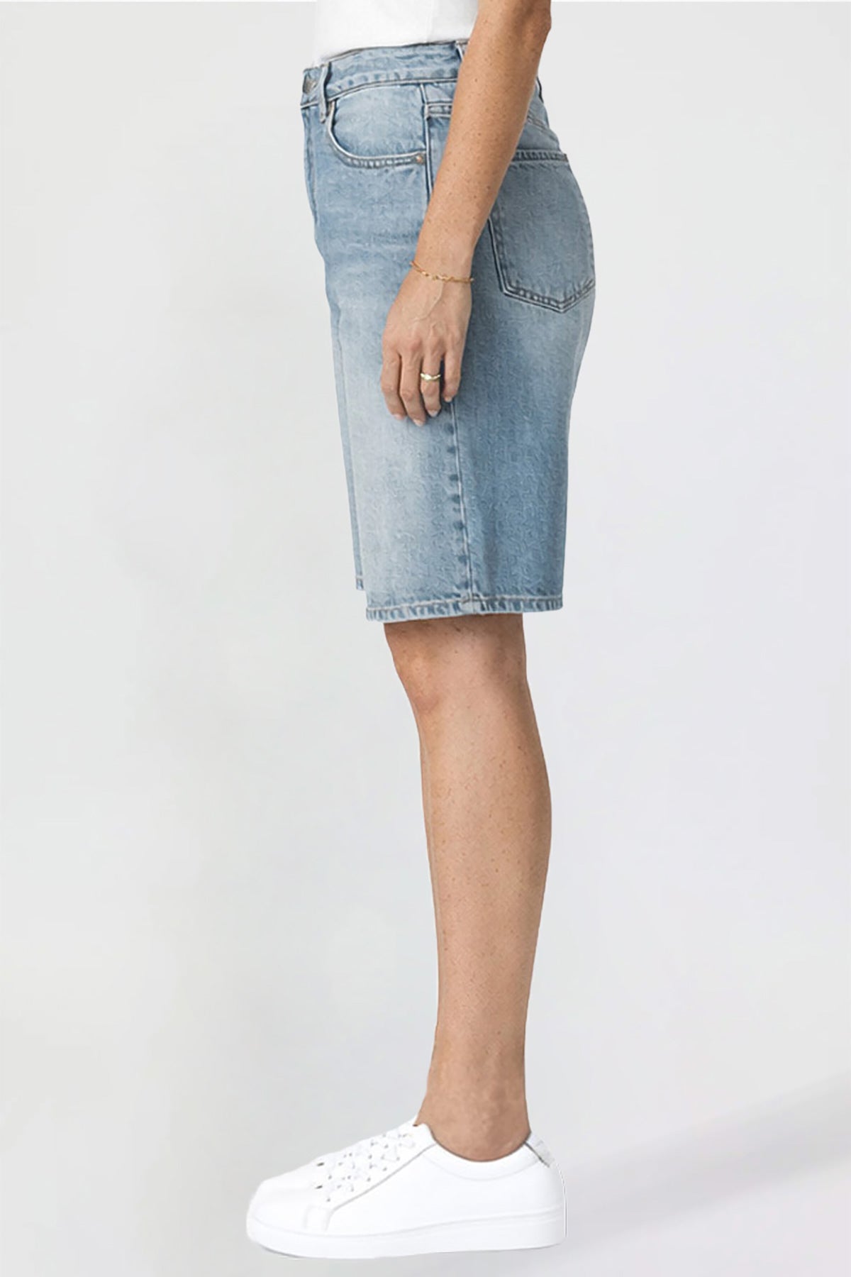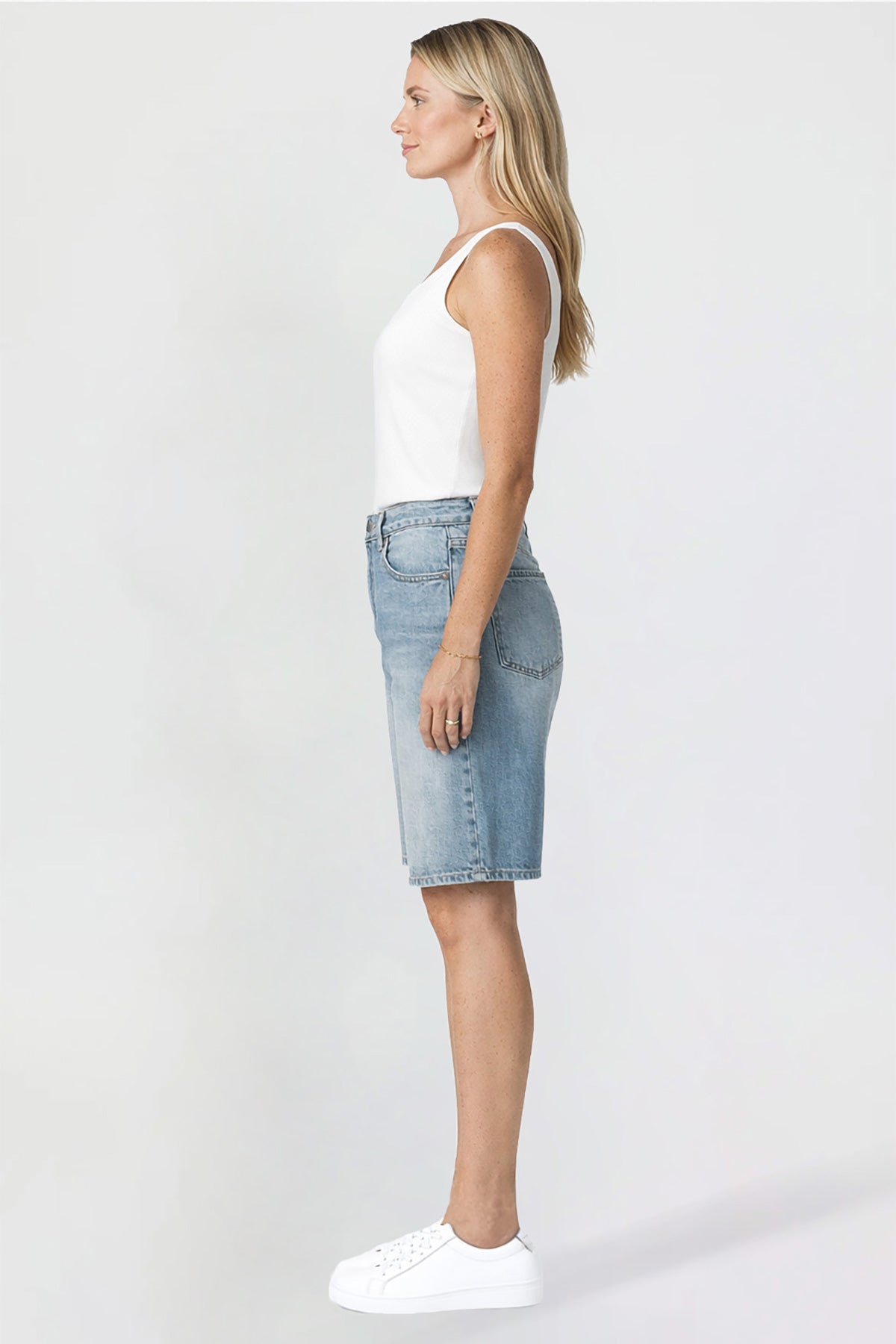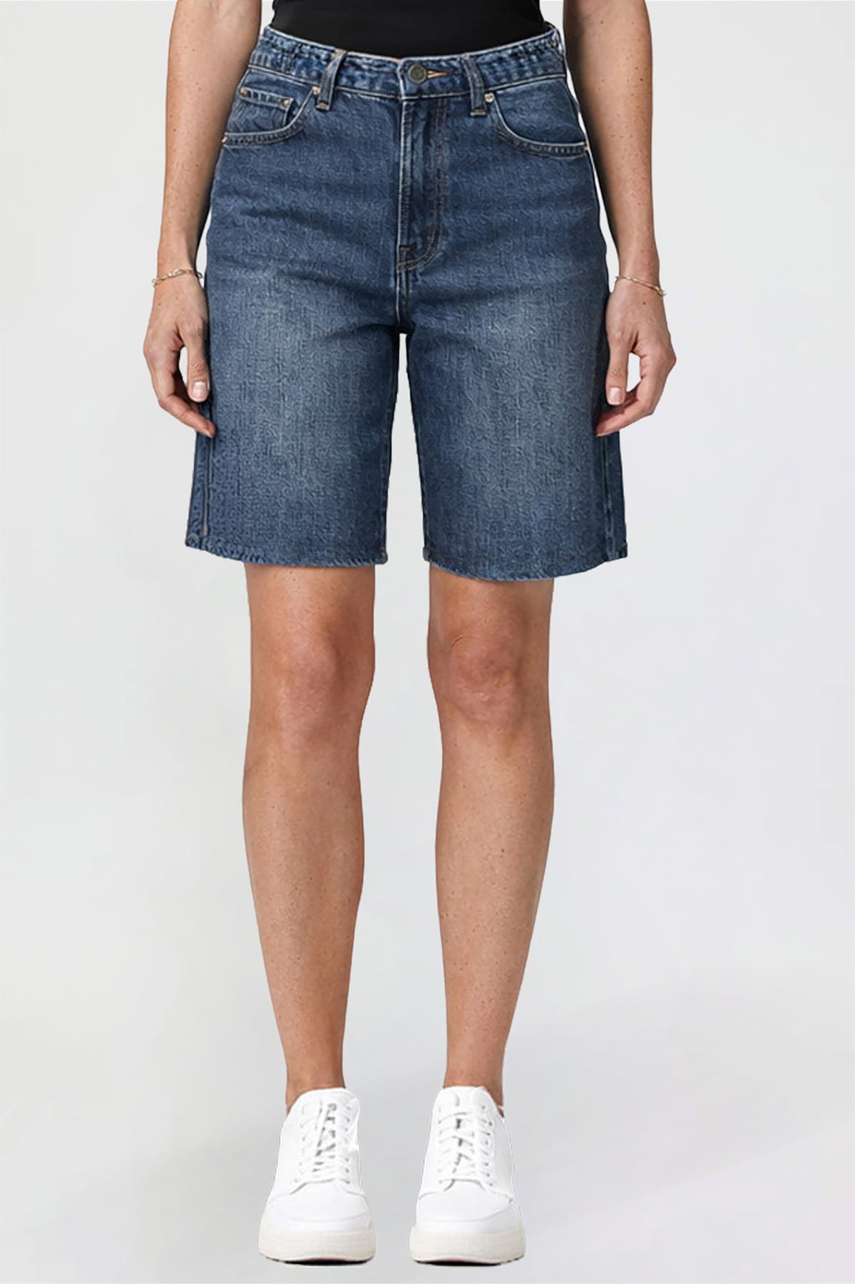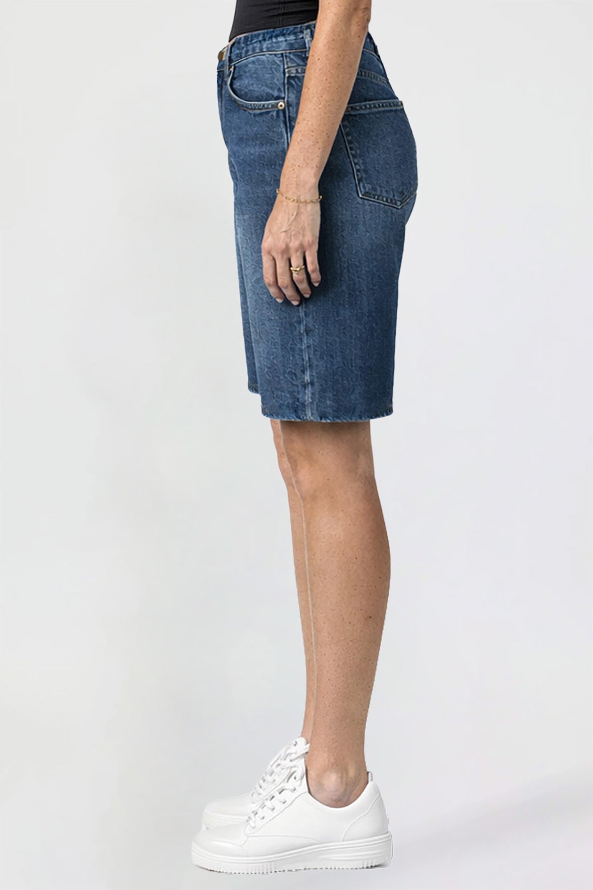 Stay cool and casual in our Women’s Relaxed Bermuda Shorts. Designed with a relaxed fit and longer inseam, these shorts offer effortless coverage and all-day comfort. The frayed hem adds a touch of laid-back style, while classic five-pocket styling and a button-and-zipper closure keep them timeless and easy to wear. Made from durable cotton denim, they’re perfect for everyday summer adventures.