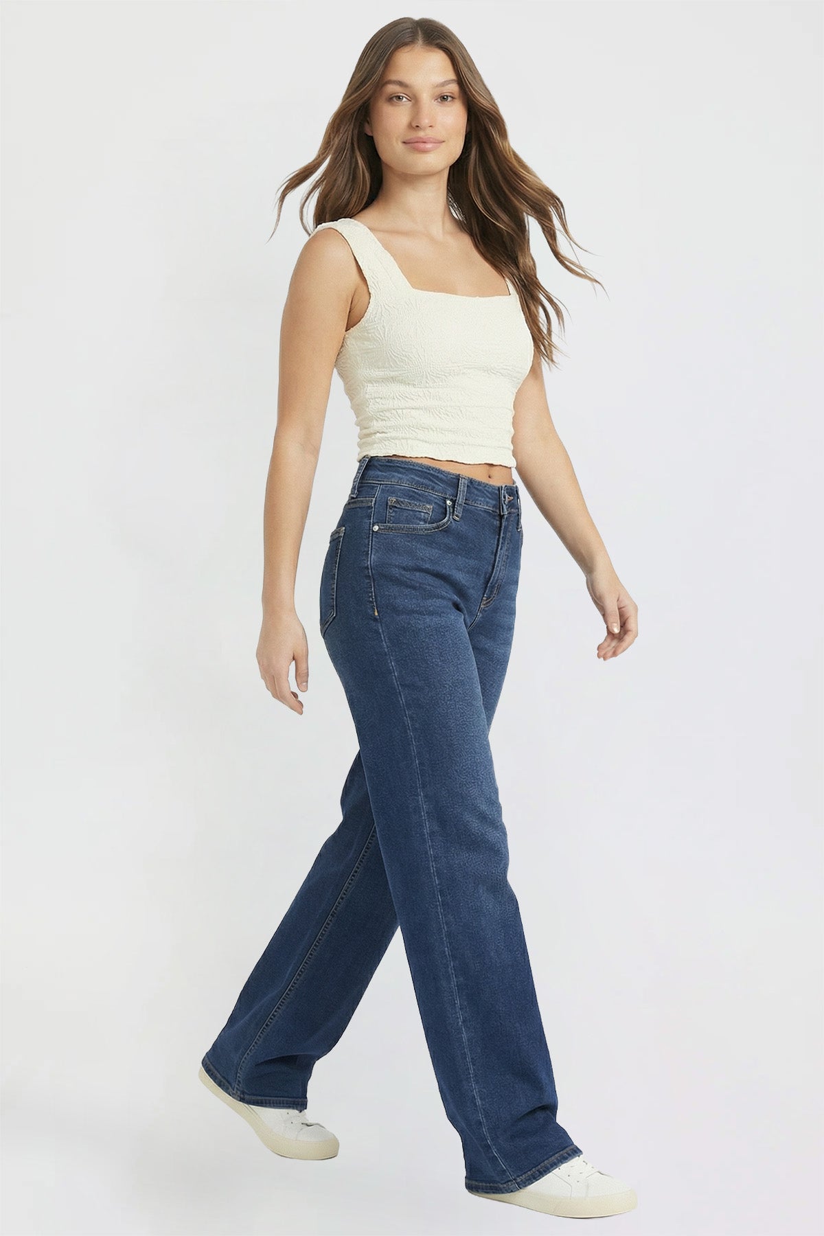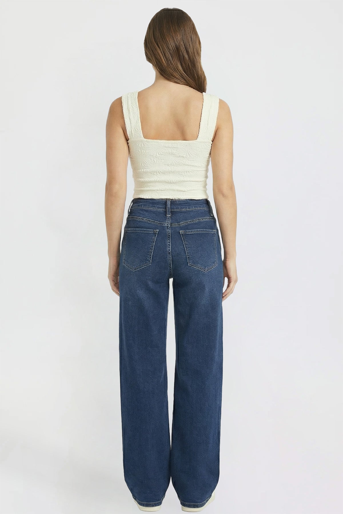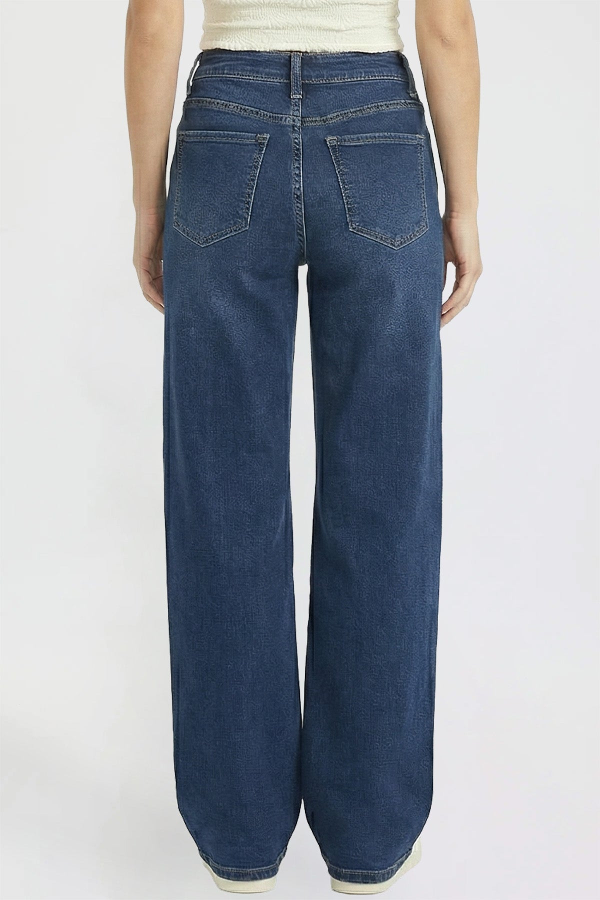 The high-rise waist flatters and supports, while the wide leg adds a modern, relaxed vibe that moves effortlessly from day to night. Finished with classic five-pocket styling, a button and zipper fly, and belt loops, these jeans are the perfect blend of comfort, versatility, and on-trend style.