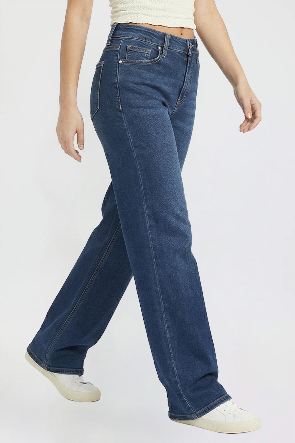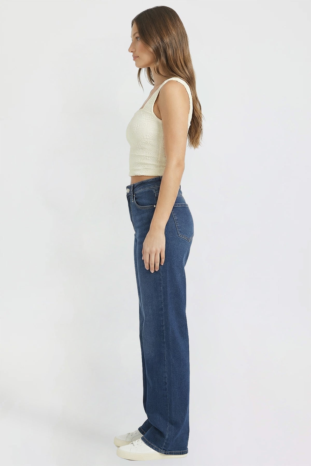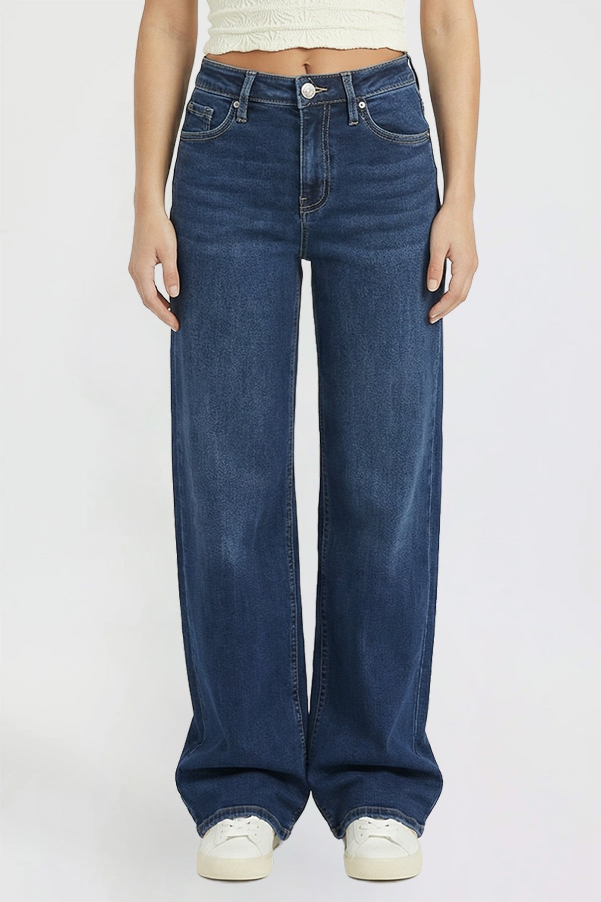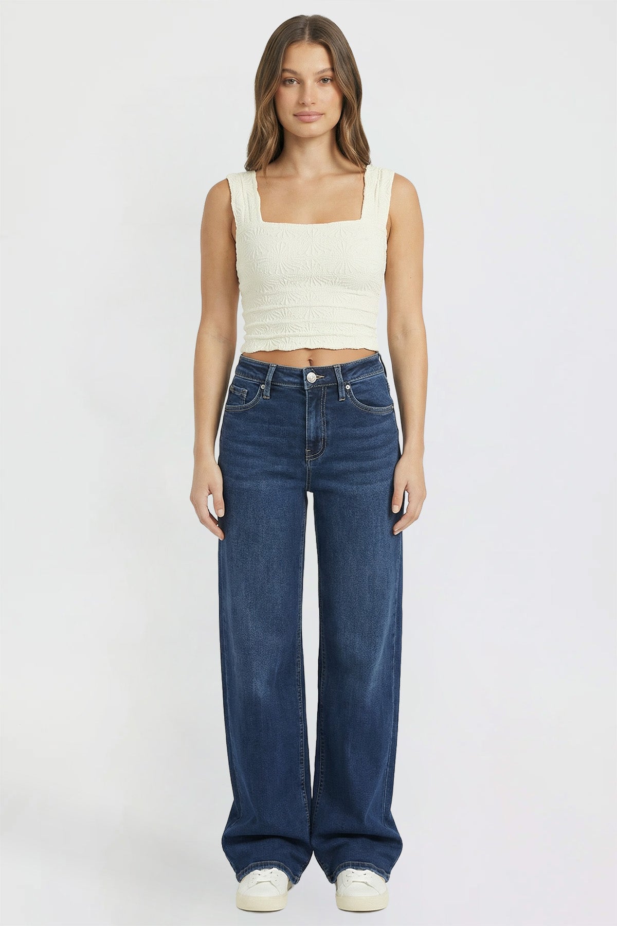 The high-rise waist flatters and supports, while the wide leg adds a modern, relaxed vibe that moves effortlessly from day to night. Finished with classic five-pocket styling, a button and zipper fly, and belt loops, these jeans are the perfect blend of comfort, versatility, and on-trend style.