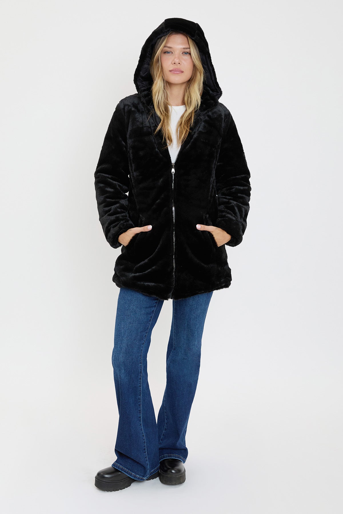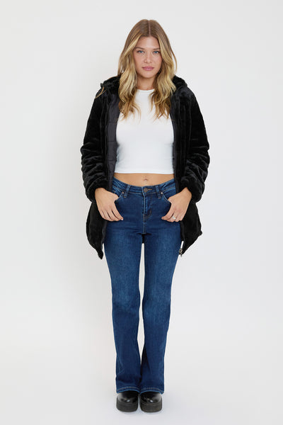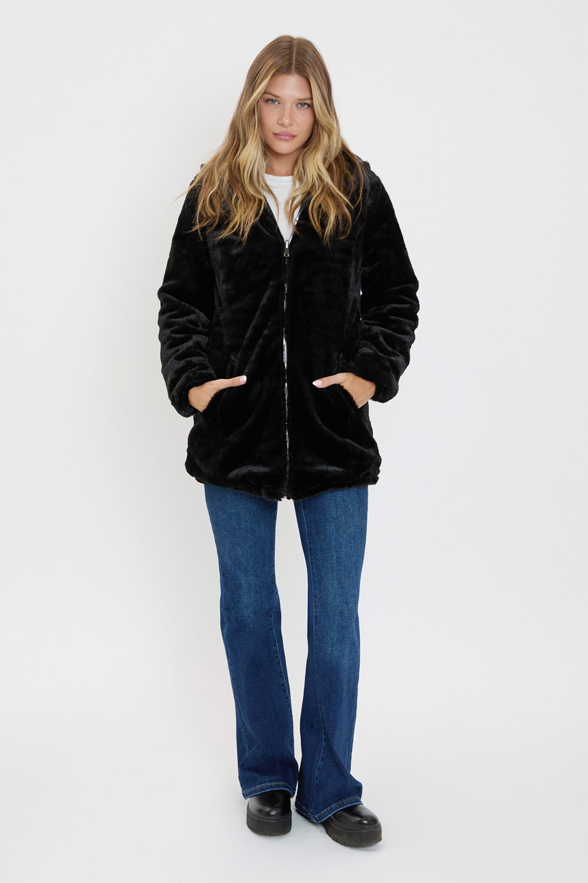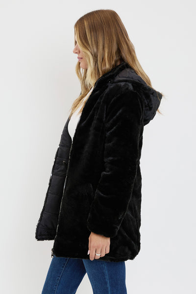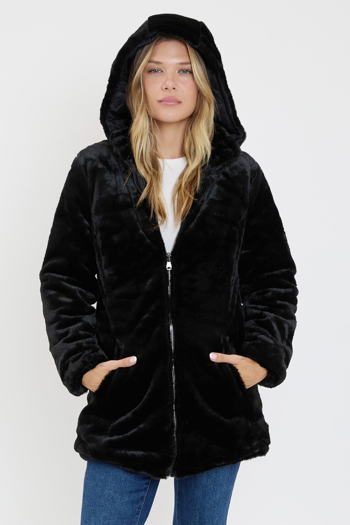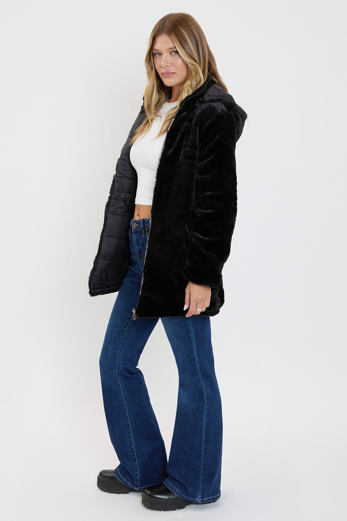 Bring on the cold! Our Faux Fur Reversible Jacket has you covered and cozy! Our reversible jacket has everything you need this season! One side features a quilted puffer jacket with a soft and fuzzy interior. It also has 2 front pockets and drawstrings to cinch you in at the waist. The other side features a comfy-as-a blanket faux fur exterior with a light and airy quilted interior, and 2 front pockets. Both sides have a detachable zippered hood for convenience and ease! Believe us when we say you wonβt want to take this jacket off! Style it with your favorite YMI jeans, boots, and a beanie for a chic look, or wear it more comfy with sweatpants and sneakers!