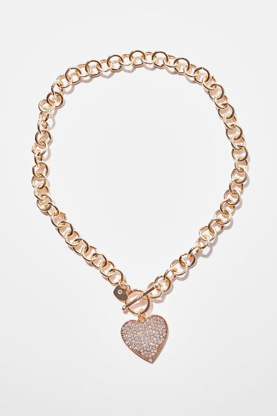 A high-polish gold-tone necklace featuring oval link chain, a heart pendant with rhinestone embellishments, and a toggle buckle closure. Show off your glamorous side with this dazzling gold-tone necklace. Its chic oval link chain complements the sparkling rhinestone heart pendant for a stunning look that will catch everyone's eye. Plus, the toggle buckle closure makes it easy to put on and take off, so you can spend less time getting ready and more time looking fabulous!