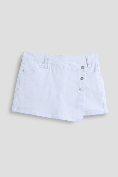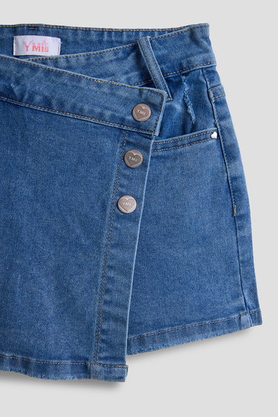 The Girls Asymmetrical Denim Skort combines the best of style and comfort with a unique design. Featuring an asymmetrical front panel and an exposed back short, this skort offers the look of a skirt with the ease of shorts. The 3-button placket adds a stylish touch, while the soft fabric blend with a hint of stretch ensures all-day comfort. With a 4-inch inseam, it provides just the right amount of coverage for any activity. Perfect for pairing with any favorite top, this skort is a fun and versatile addition to any outfit.