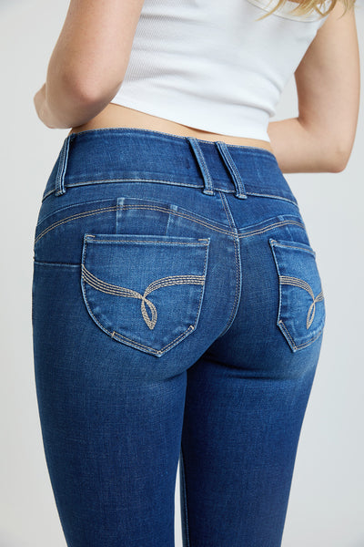 Flatter your curves in the Women’s Luxe Mid Rise 3-Button WannaBettaButt Skinny Jeans—designed to lift, shape, and contour in all the right places. With signature stitching on the back pockets and a sleek skinny leg, these jeans offer a streamlined look that moves with you. The mid-rise waist provides a comfortable fit that hugs your hips without slipping.