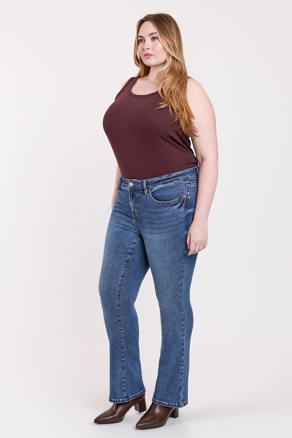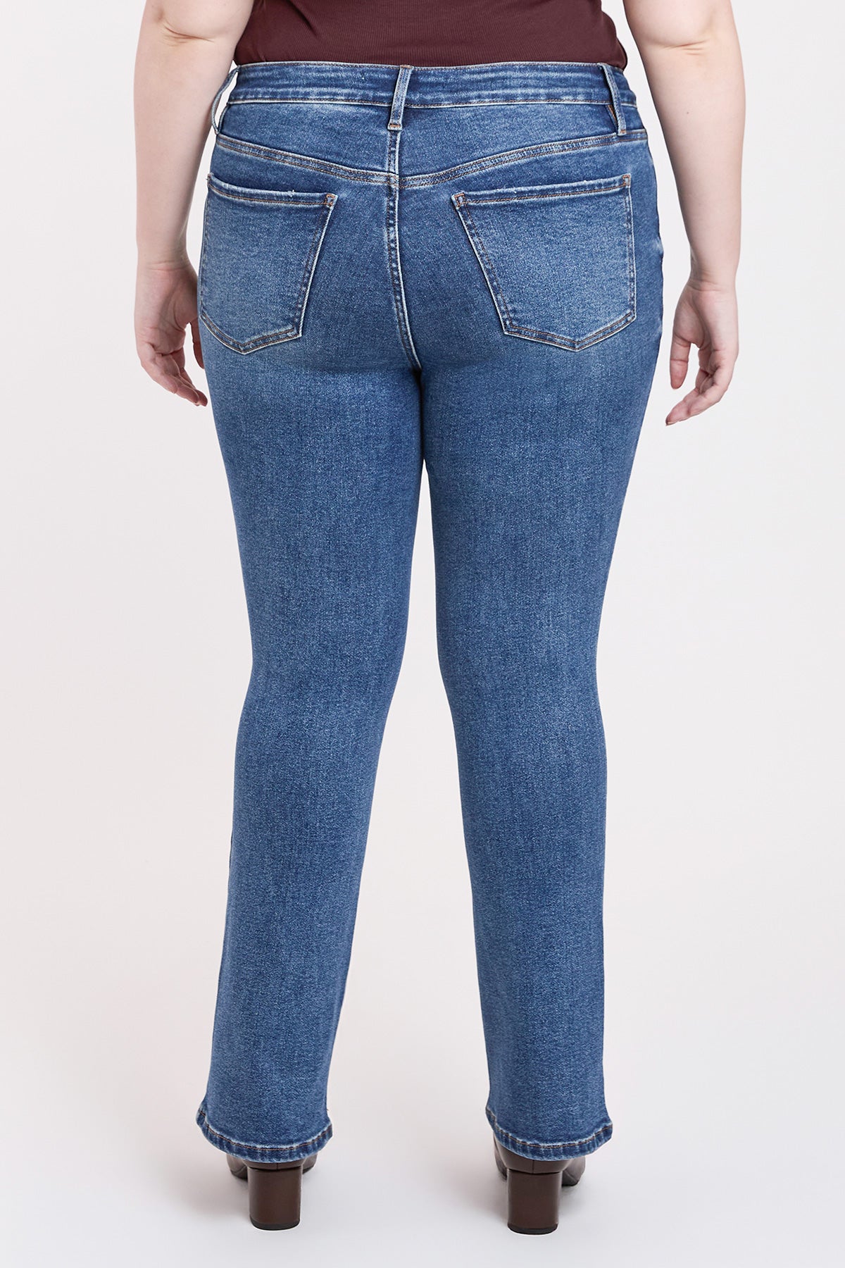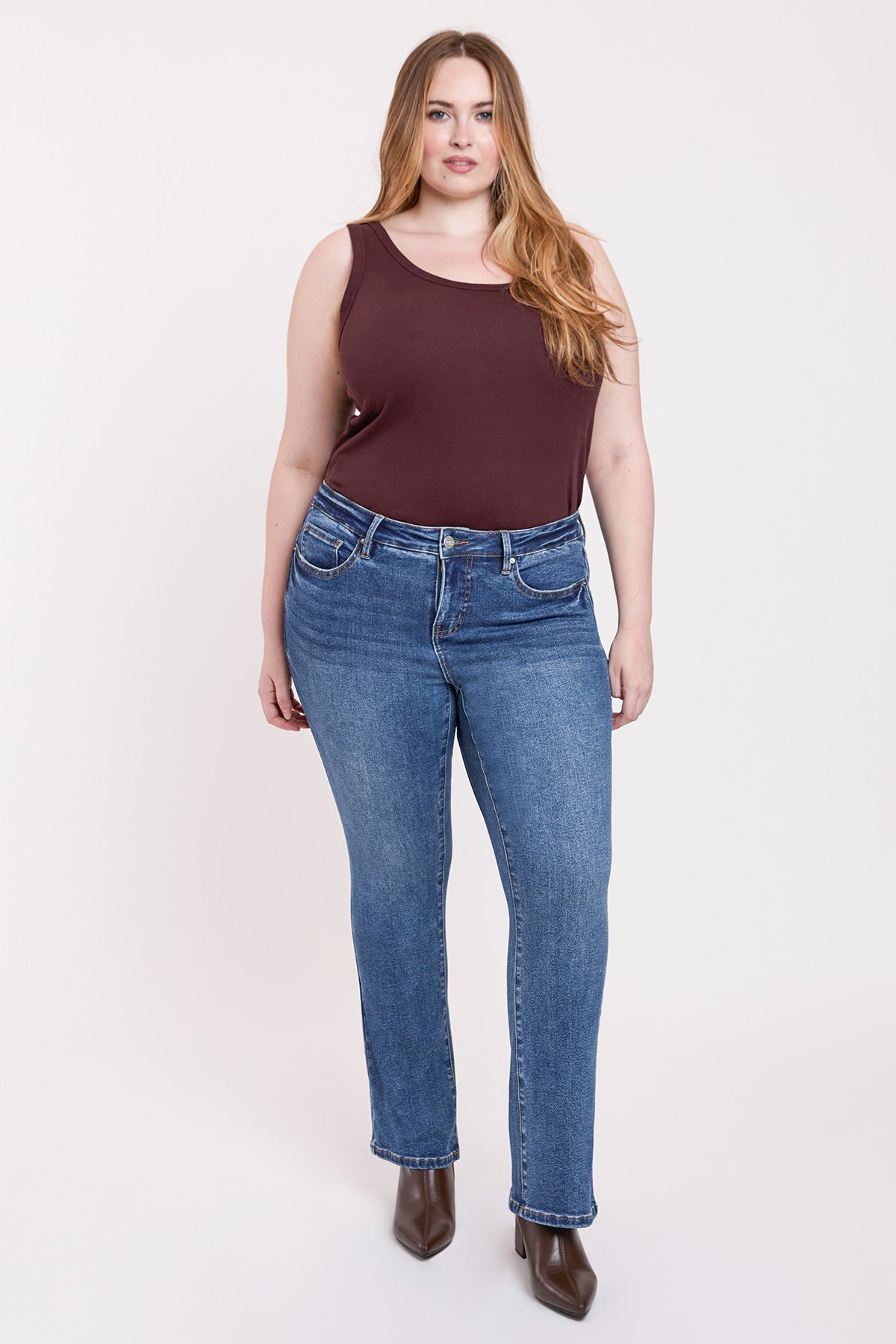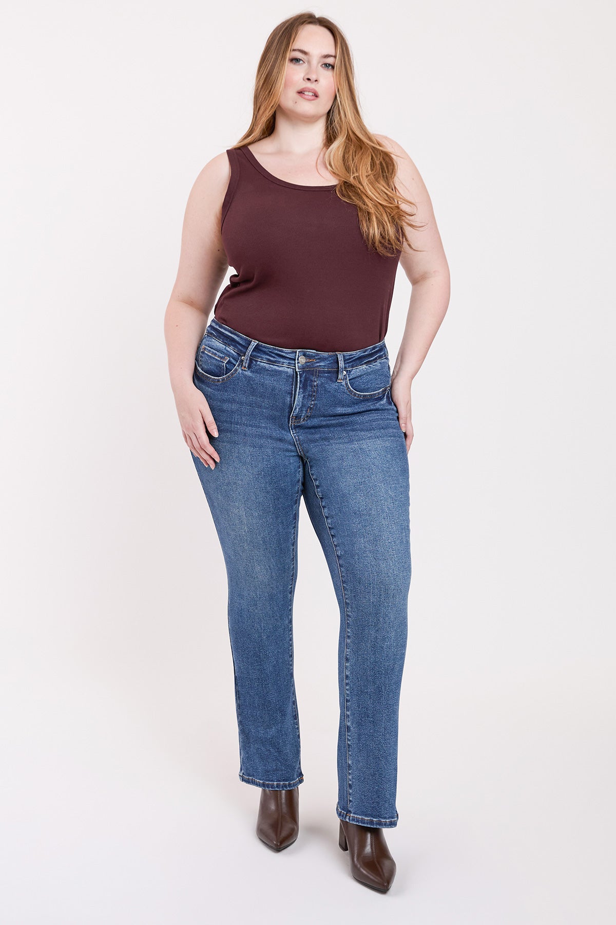 The high-rise waist and double-button closure provide extra support and a smooth, held-in feel. A bootcut leg adds balance and versatility, making them perfect to pair with boots, sneakers, or heels. Finished with functional pockets, belt loops, and a zip fly—these jeans are a must-have for effortless, everyday style.